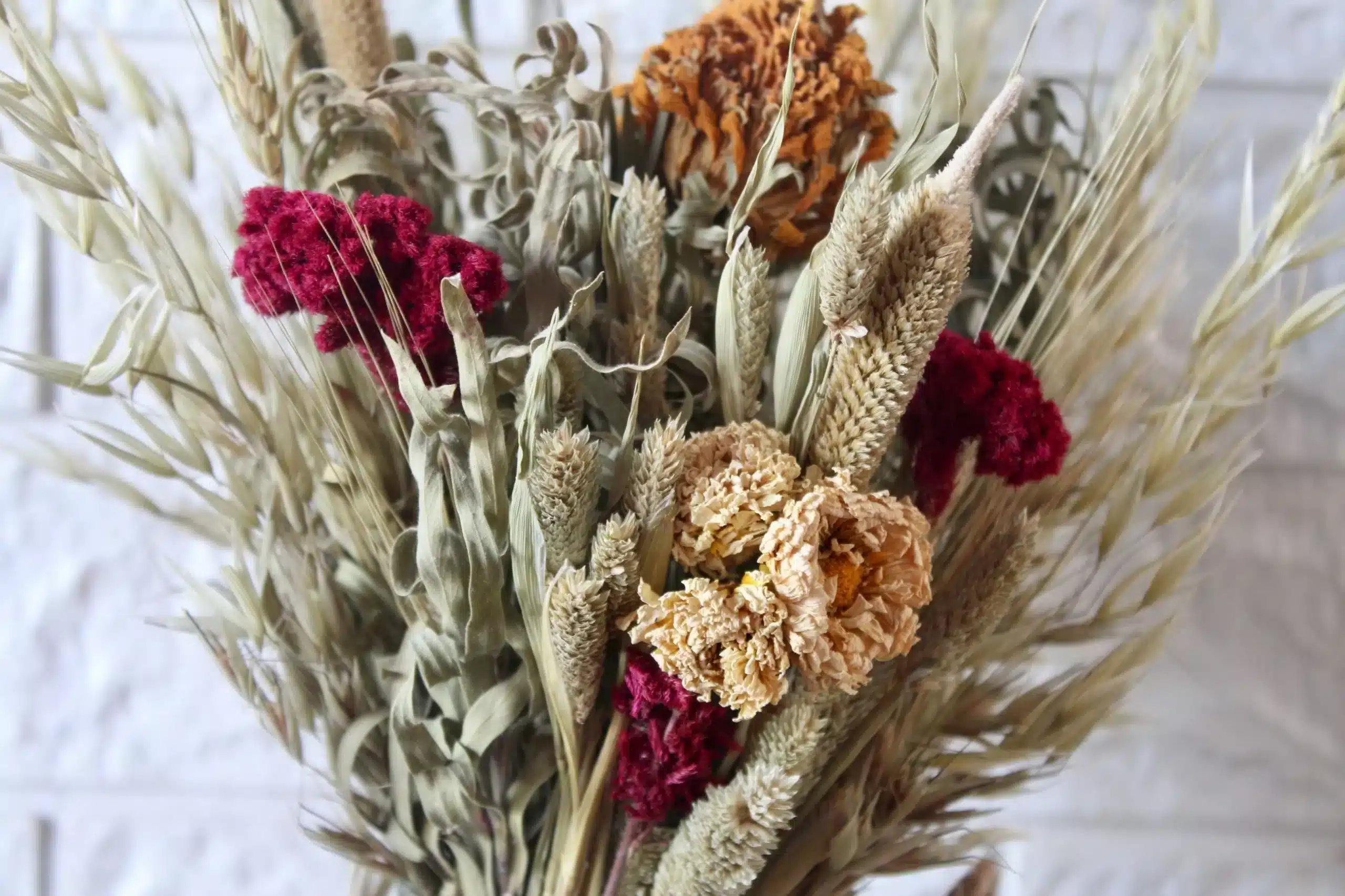 Links: Globe Amaranth / Dried Eucalyptus / Light Brown Fern / Dried Palm Leaves / Golden White Eucalyptus / Pink Dried Palm Leaves / White Bunny Tails / Nigella Orientalis / Burgundy Bunny Tails / White Ruscus