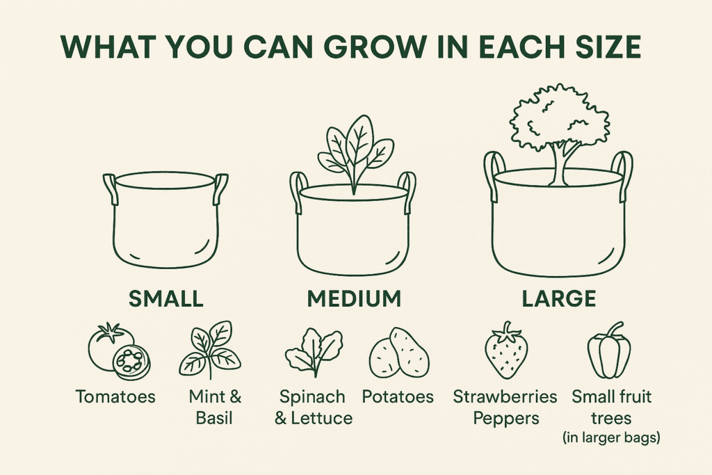 They come in various sizes, perfect for herbs, vegetables, fruits, and even small trees.